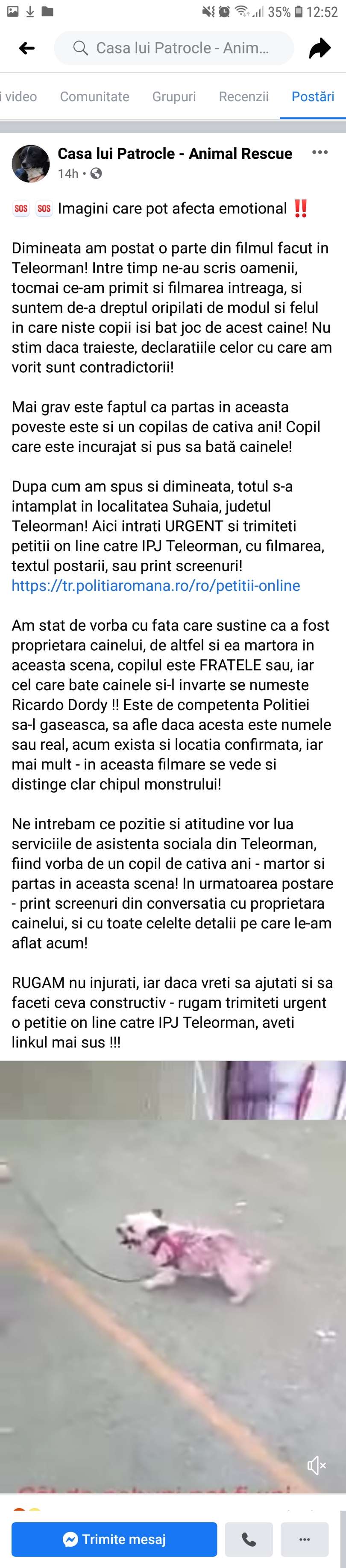 Ne intrebam ce pozitie si atitudine vor lua serviciile de asistenta sociala din Teleorman, fiind vorba de un copil de cativa ani – martor si partas in aceasta scena! In urmatoarea postare – print screenuri din conversatia cu proprietara cainelui, si cu toate celelte detalii pe care le-am aflat acum!