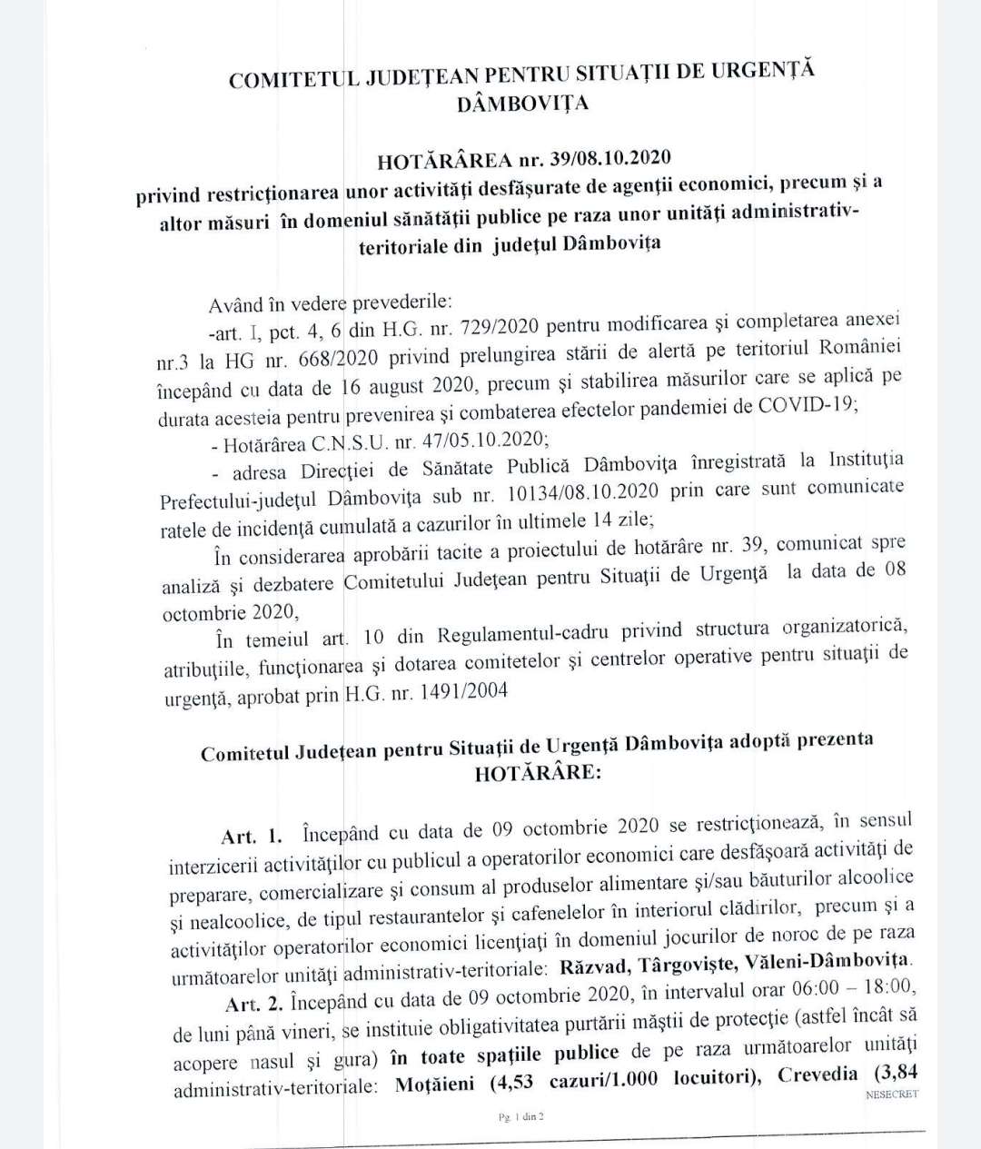 Astfel, începând cu data de 09 octombrie 2020 se restricţionează, în sensul interzicerii activităţilor cu publicul a operatorilor economici care desfăşoară activităţi de preparare, comercializare şi consum al produselor alimentare şi/sau băuturilor alcoolice şi nealcoolice, de tipul restaurantelor şi cafenelelor în interiorul clădirilor, precum şi a activităţilor operatorilor economici licenţiaţi în domeniul jocurilor de noroc de pe raza următoarelor unităţi administrativ-teritoriale: Răzvad, Târgovişte, Văleni-Dâmboviţa.