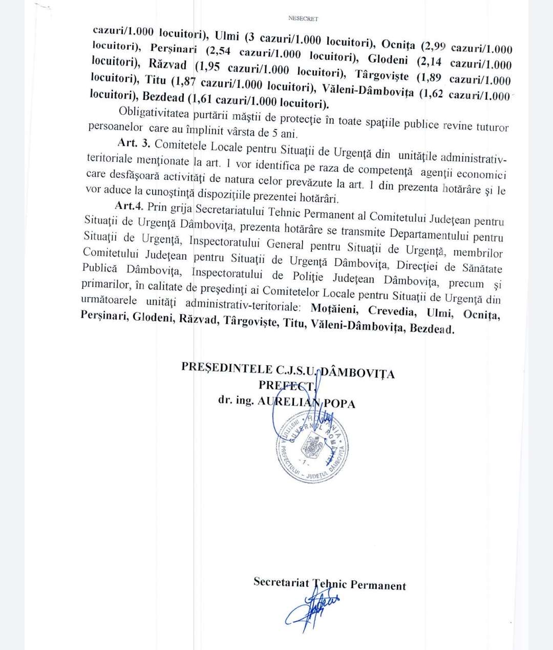 De asemenea, începând cu data de 09 octombrie 2020, în intervalul orar 06:00 – 18:00, de luni până vineri, se instituie obligativitatea purtării măştii de protecţie (astfel încât să acopere nasul şi gura) în toate spaţiile publice de pe raza unităţilor administrativ-teritoriale în care rata incidenței cumulate a cazurilor depășește 1,5/1000 de locuitori, respectiv: Moţăieni, Crevedia, Ulmi, Ocniţa, Perşinari, Glodeni, Răzvad, Târgovişte , Titu , Văleni-Dâmboviţa, Bezdead.