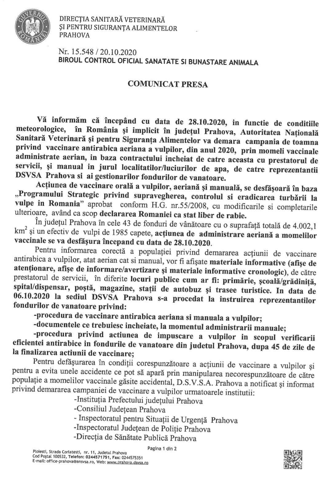 Autoritatea Națională Sanitară Veterinară și pentru Siguranța Alimentelor anunță printr-un comunicat de presă că în perioada următoare va demara campania de vaccinare antirabică a vulpilor. DSVSA Prahova transmite cetățenilor că acest lucru se va intampla începând cu data de 28 octombrie.
