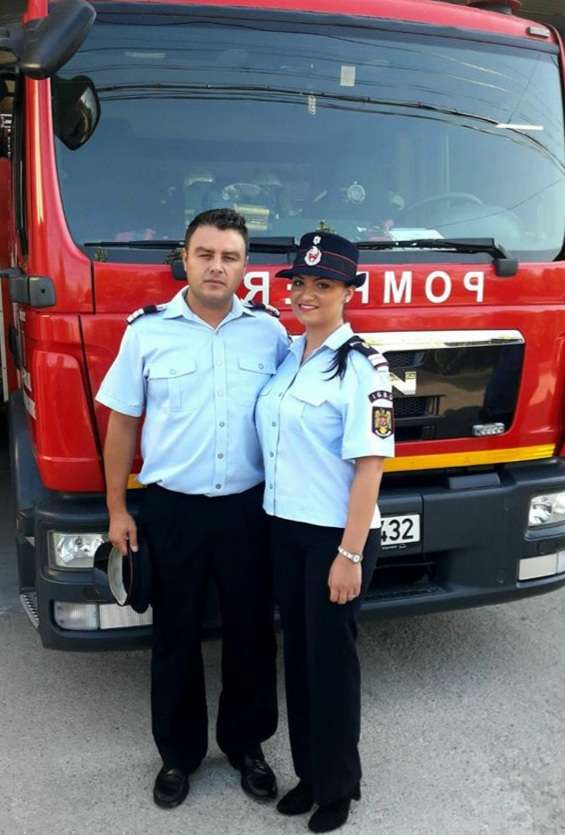 În fotografie este Mihaela alături de soțul său, care este tot pompier, la Garda de Intervenție Roata de Jos…transmite ISU Giurgiu