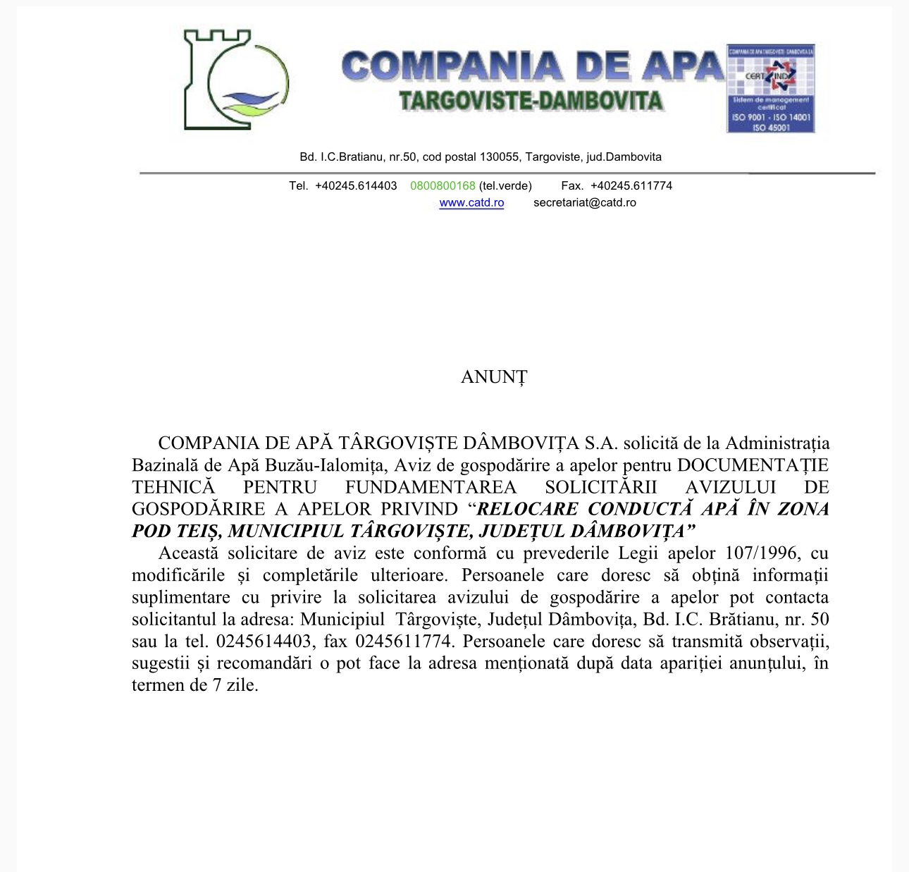 C.A.T.Dâmbovita: Anunt publicitate- Solicitare aviz relocare conducta de apă in zona Pod Teiș -Târgoviste Dâmbovita