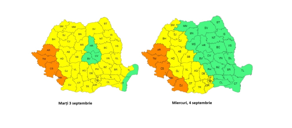 Avertizarea ANM este valabilă astăzi, 3 septembrie, pentru aproape toată țara. Se vor înregistra temperaturi deosebit de ridicate pentru începutul lunii septembrie (7…10 grade peste mediile multianuale). Local va fi caniculă și disconfort termic ridicat. Temperaturile maxime vor fi în general de 32…35 de grade.