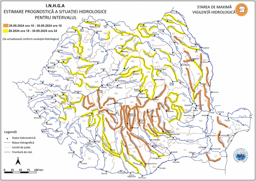 În intervalul 29.09.2024 ora 06:00 – 30.09.2024 ora 24:00 pe râurile din bazinele hidrografice: Mureş – bazin amonte S.H. Glodeni, Niraj (judeţele: Harghita și Mureş), Mureş – afluenţii aferenţi sectorului aval confluenţă cu râul Arieș – amonte confluenţă cu râul Târnava (judeţele: Alba și Cluj), Târnava Mică – bazin amonte S.H. Târnăveni şi afluenţii aferenţi sectorului aval S.H. Târnăveni (judeţele: Harghita, Mureş și Alba), Târnava Mare – bazin amonte S.H. Odorheiu Secuiesc şi afluenţii aferenţi sectorului aval S.H. Odorheiu Secuiesc (judeţele: Harghita, Mureş, Braşov, Sibiu și Alba), Mureş – afluenţii aferenţi sectorului aval confluenţă cu râul Târnava – amonte S.H. Brănișca (judeţele: Alba, Sibiu și Hunedoara), Jiu – bazin amonte S.H. Sadu şi afluenţii aferenţi sectorului aval S.H. Sadu – amonte confluenţă cu râul Gilort (judeţele: Hunedoara şi Gorj), Gilort – bazin superior şi afluenţi bazin mijlociu şi inferior (judeţul Gorj), Olt – bazin amonte S.H. Hoghiz şi afluenţii aferenţi sectorului aval S.H. Hoghiz (judeţele: Harghita, Covasna, Braşov, Sibiu, Vâlcea, Gorj, Argeş, Olt şi Dolj), Călmăţui (judeţele: Olt și Teleorman), Vedea (judeţele: Argeș, Olt și Teleorman), Argeş – bazin superior şi afluenţi bazin mijlociu şi inferior (judeţele: Argeş, Dâmboviţa, Teleorman, Giurgiu şi Ilfov), Ialomiţa – bazin amonte S.H. Siliştea Snagovului (judeţele: Dâmboviţa, Prahova şi Ilfov), Prahova (judeţele: Prahova şi Ialomiţa), Buzău – bazin amonte Ac. Siriu şi afluenţii aferenţi sectorului aval Ac. Siriu – amonte S.H. Baniţa (judeţele: Braşov, Covasna, Buzău şi Prahova), Rm. Sărat – bazin superior şi afluenţi bazin mijlociu şi inferior (judeţele: Vrancea și Buzău), Putna – bazin superior şi afluenţi bazin mijlociu şi inferior (judeţul Vrancea), Trotuş – bazin amonte S.H. Ghimeş Făget şi afluenţii aferenţi sectorului aval S.H. Ghimeş Făget (judeţele: Harghita, Bacău, Neamţ, Covasna şi Vrancea), Bistriţa – bazin amonte S.H. Cârlibaba şi afluenţii aferenţi sectorului aval S.H. Cârlibaba (judeţele: Suceava, Neamţ, Harghita şi Bacău), Moldova – bazin superior şi afluenţi bazin mijlociu şi inferior (judeţele: Suceava şi Neamţ), Suceava – bazin superior şi afluenţi bazin mijlociu şi inferior (judeţul Suceava), Bârlad (judeţele: Neamţ, Iaşi, Vaslui, Bacău, Galaţi şi Vrancea), Siret – afluenţii mici aferenţi sectorului aval confluenţă cu râul Moldova (judeţele: Neamţ, Bacău, Vrancea și Galaţi), Prut – afluenţii aferenţi sectorului amonte confluenţă cu râul Jijia (judeţele: Botoşani şi Iaşi), Jijia – bazin superior şi afluenţi bazin milociu şi inferior (judeţele: Botoşani şi Iaşi), Prut – afluenţii aferenţi sectorului aval confluenţă cu râul Jijia (judeţele: Iaşi, Vaslui și Galaţi) și râurile din Dobrogea (judeţele: Tulcea și Constanţa).