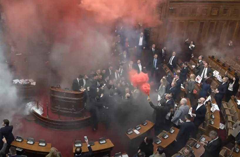 În prima ședință din această primăvară a Parlamentului sârb, după prezentarea ordinei de zi, un deputat din opoziție s-a îndreptat spre podium, dar a fost oprit de securitatea parlamentară. Imediat, mai mulți colegi de-ai săi au provocat o încăierare și au aprins grenade fumigene, declanșând haos.