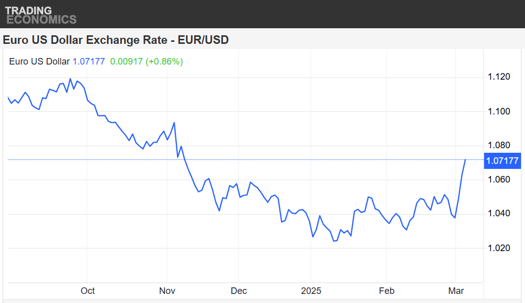 Euro crește rapid și a depășit 1,07 dolari, cel mai mare nivel din noiembrie 2024, iar randamentele obligațiunilor germane și franceze se apreciază și ele. Acțiunile companiilor germane de infrastructură (Heidelberg, Bilfinger) au crescut cu până la 17%, iar Thyssenkrupp, cel mai mare producător de oțel din Germania, are o creștere de 14%. De asemena, companiile de armament europene (Rheinmetall, Thales) au creșteri de 5-7%.