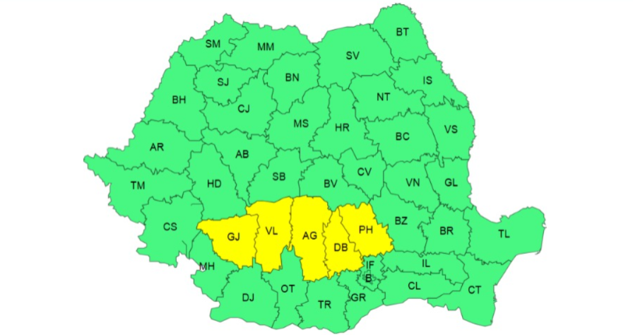 În județele Vâlcea, Gorj, Argeș, Prahova și Dâmbovița este în vigoare un Cod Galben de ploi, până sâmbătă dimineața. Vor fi averse însemnate cantitativ, iar în timp scurt sau prin acumulare cantitățile de apă vor fi de 25…50 l/mp.