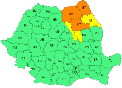- Cod Portocaliu, valabil azi de la ora 16 până la ora 22, pentru județele Suceava, Botoșani și Neamț. Vor fi averse torențiale, frecvente descărcări electrice, vijelii puternice (viteze ale vântului de 70-80 km/h) și grindină de medii dimensiuni (2-3 cm). În intervale scurte de timp sau prin acumulare, cantitățile de apă vor fi de 30-40 l/mp și pe arii restrânse de peste 50-60 l/mp.
