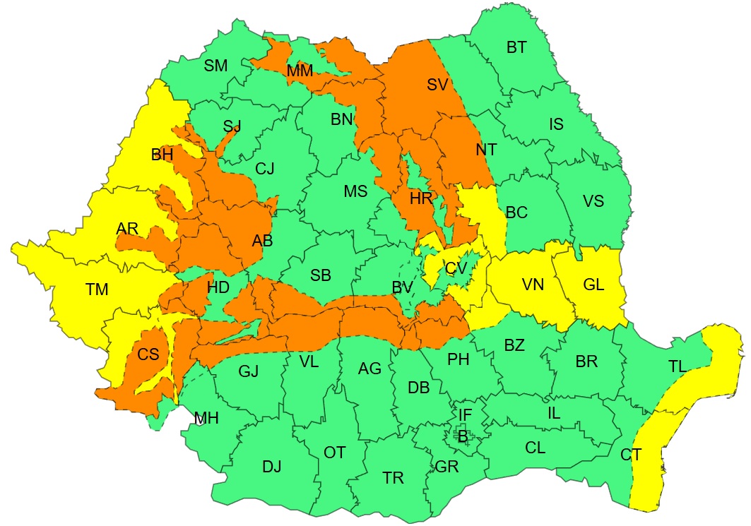 - Cod Galben de vânt în Banat, Crișana, sudul Moldovei și pe litoral, cu viteze de 50-70 km/h.
