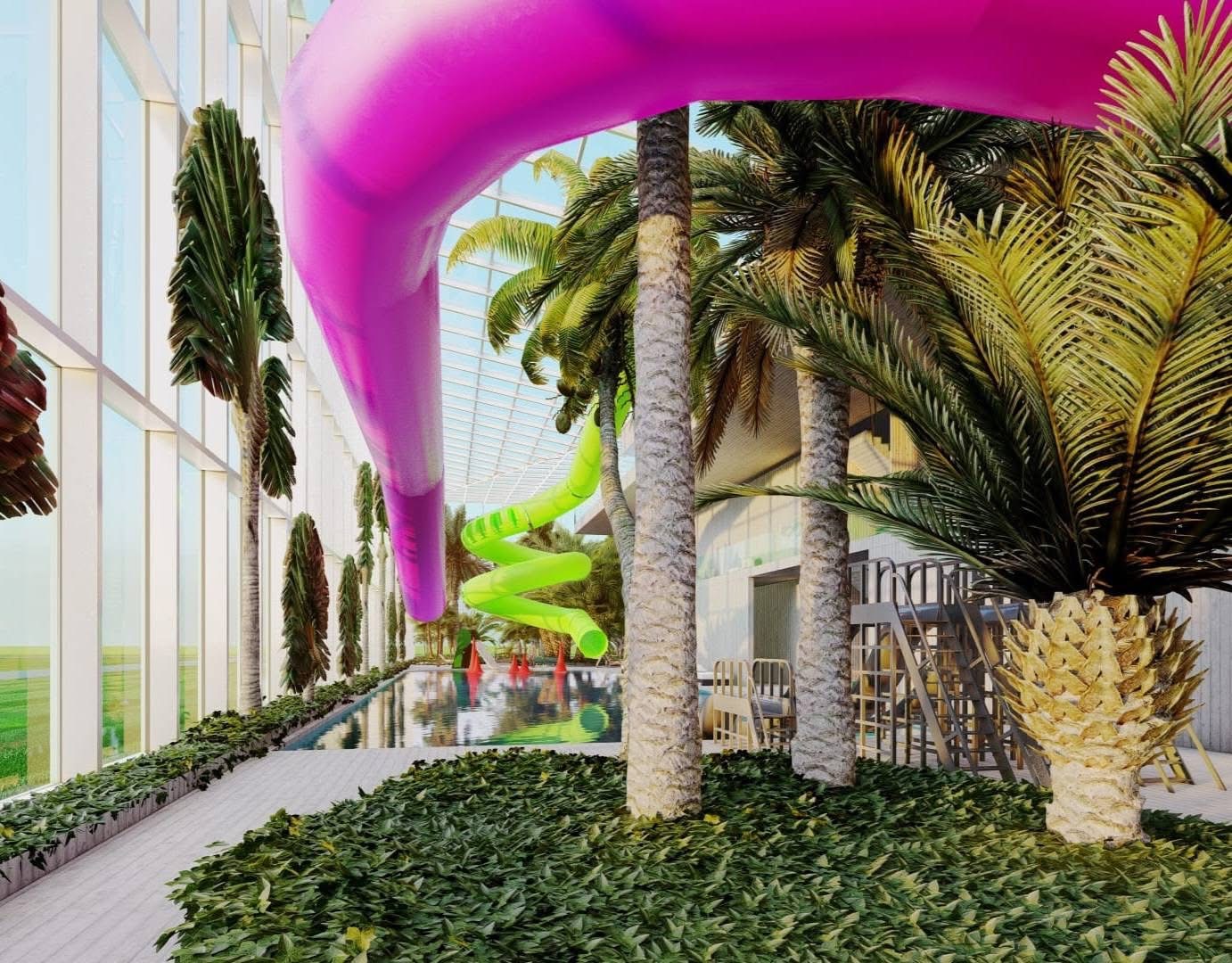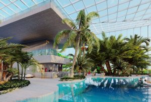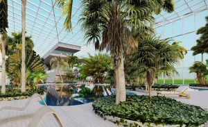 Obiectivul de investiții, finanțat din fonduri europene, va fi construit în vecinătatea bazinului olimpic, de care va fi legat printr-o pasarelă și va fi structurat pe 3 etaje, cuprinzând plajă și o piscină principală, piscine minerale, jacuzzi, zonă tobogane, piscină cu valuri, piscină pentru copii, loc de joacă cu apă, grădini interioare, saune uscate, saune umede, salină, dar și o zonă tip “foodcourt”.