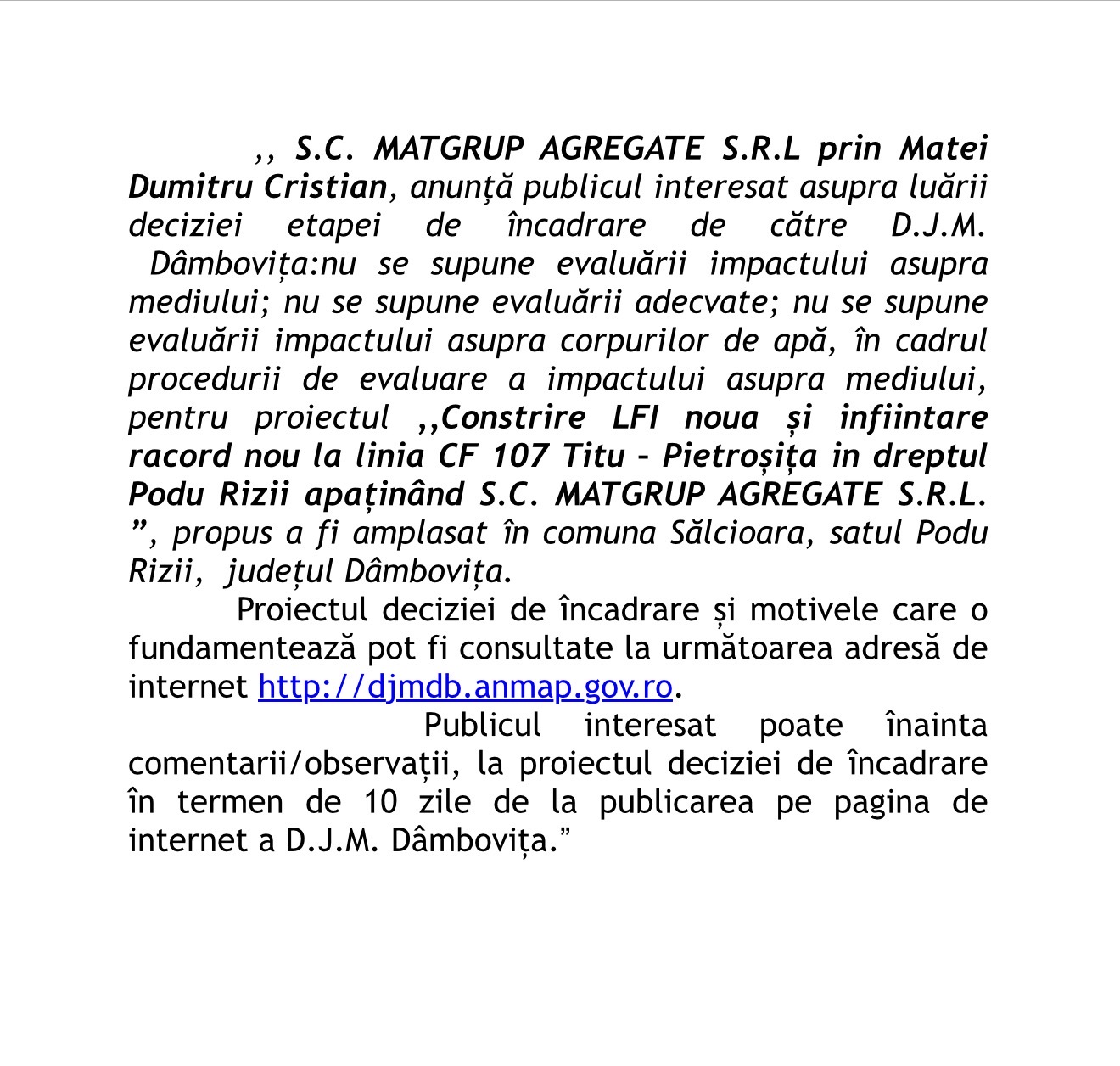 Anunt Publicitate- SC Matgrup Agregate SRL