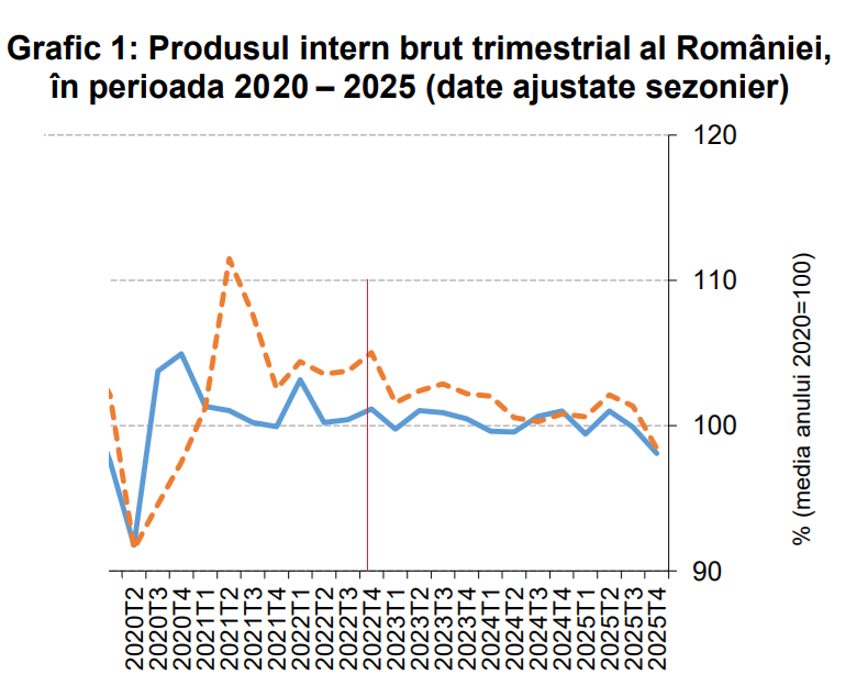 Statistica oficială (INSSE) a calculat că în ultimul trimestru din 2025 economia României a scăzut în termeni reali cu -1,9% față de trimestrul anterior. Cum și trimestrul a III-lea din 2025 a fost unul de scădere (-0,1%, corectat – anterior INSSE anunțase o scădere de -0,2%), oficial România este în “recesiune tehnică”.
