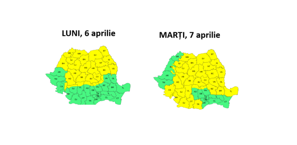 De asemenea, Administrația Națională de Meteorologie a emis mai multe avertizări Cod Galben. De luni, de la ora 12, până la ora 21, în Maramureș, Transilvania, nordul Crișanei, cea mai mare parte Moldovei și a zonei de munte vor fi intensificări ale vântului. Vântul va bate cu viteze de 50-70 km/h. La munte, rafalele vor fi de 70-80 km/h, iar la altitudini de peste 1.700 m de 90-100 km/h.
