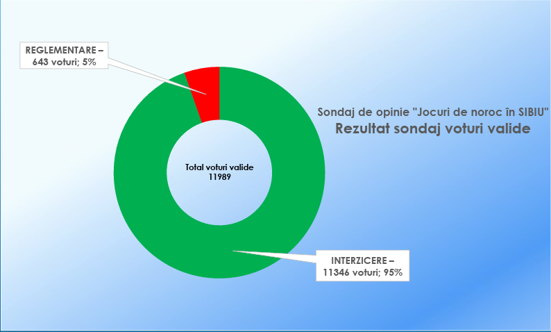 Primăria Sibiu a făcut publice vineri rezultatele sondajului de opinie pe tema jocurilor de noroc. Aproape 17 mii de persoane au votat, însă număru voturilor valide a fost de 12 mii. Conform rezultatelor publicate de primărie, circa 95% din sibieni susțin interzicerea jocurilor de noroc în municipiu. Mai exact, 11.346 de voturi au fost pentru interzicerea jocurilor de noroc în municipiul Sibiu și 643 de voturi pentru o reglementare mai strictă a jocurilor de noroc.